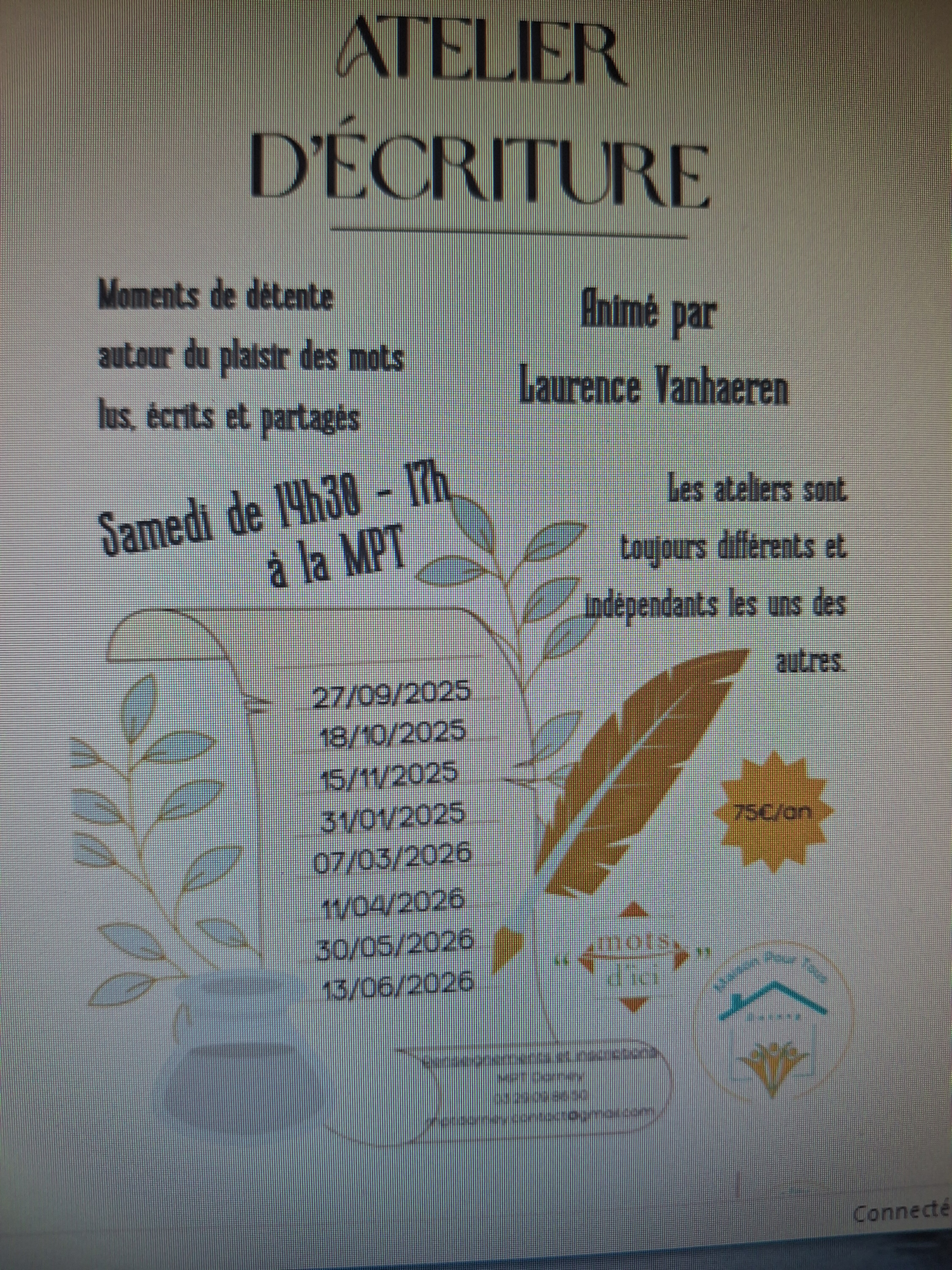 Un atelier d'écriture, animé par Laurence VANHAEREN, a lieu à la MPT , ce samedi de 14 h 30 à 17 h