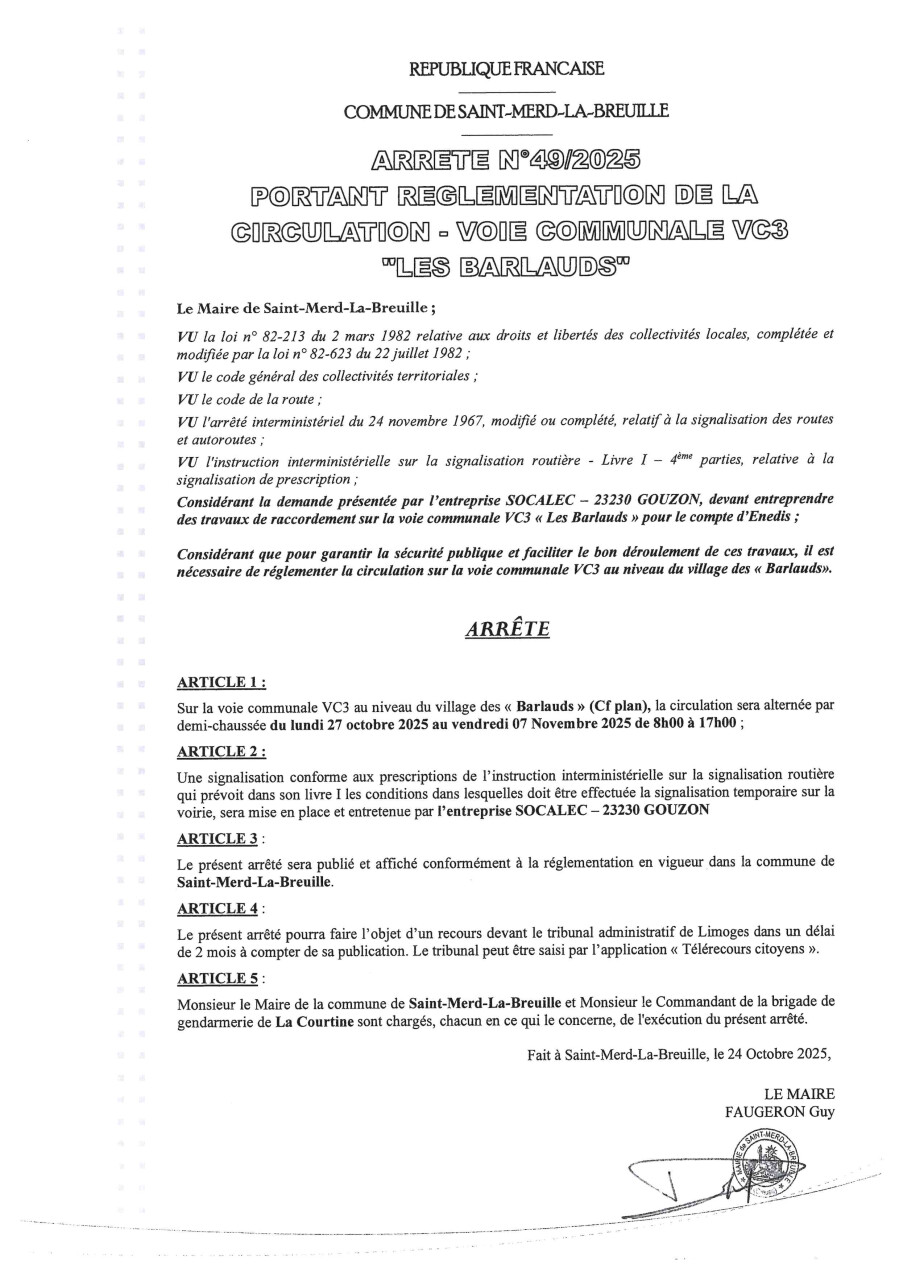 La circulation sera alternée au niveau du lieu-dit "Les Barlauds" du lundi 27 octobre 2025 au vendredi 07 novembre 2025 dans le cadre de travaux de raccordement réalisés par l'entreprise SOCALEC!
