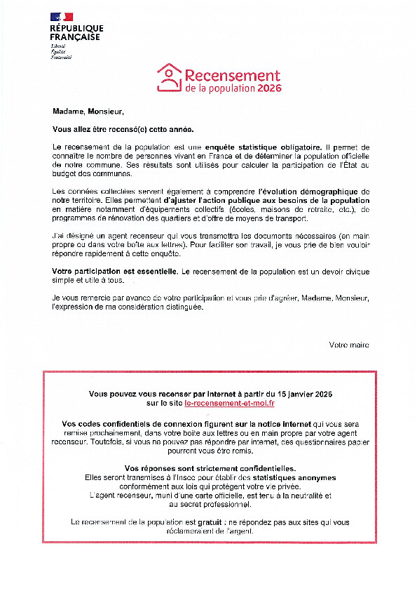 Le recensement de la population est une démarche obligatoire, réalisée régulièrement sous la responsabilité de INSEE, en lien avec la mairie. Il commence cette semaine et se termine le 15 février 2026.