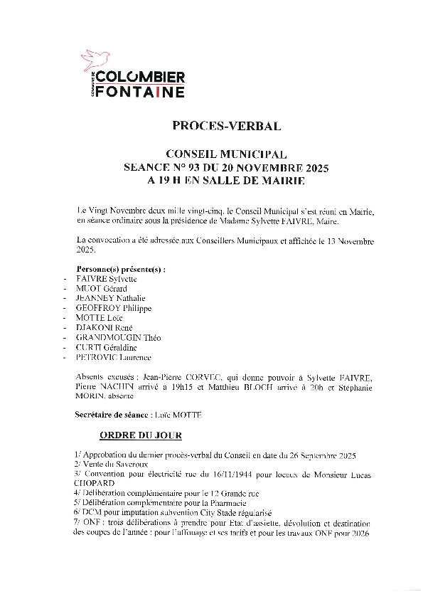 Le procès verbal du conseil municipal du 20 novembre validé le 17 décembre est disponible :