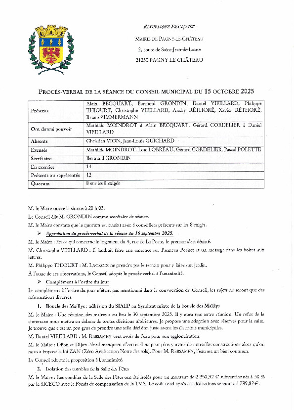 Le Conseil municipal a adopté le procès-verbal du 15 octobre 2025 dans sa séance du 29 octobre 2025.