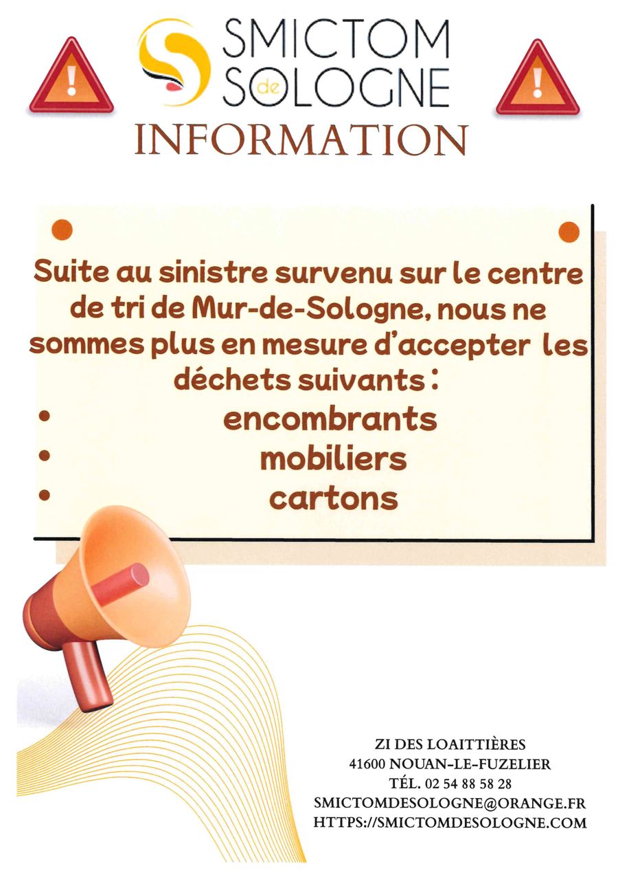 Le SMICTOM nous informe que les déchèteries de Salbris, Lamotte-Beuvron, Selles-Saint-Denis, Theillay et Souesmes peuvent à nouveau recevoir le mobilier, les cartons ainsi que les encombrants.