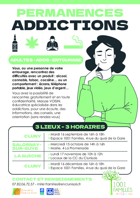 ❓Gratuites et sans rendez-vous, ces permanences s'adressent aux adultes, adolescents et à l'entourage des personnes rencontrant ces difficultés afin de trouver un lieu d'écoute, de conseils et d'informations. Elles ont lieu une fois par mois, dans 3 lieux différents.