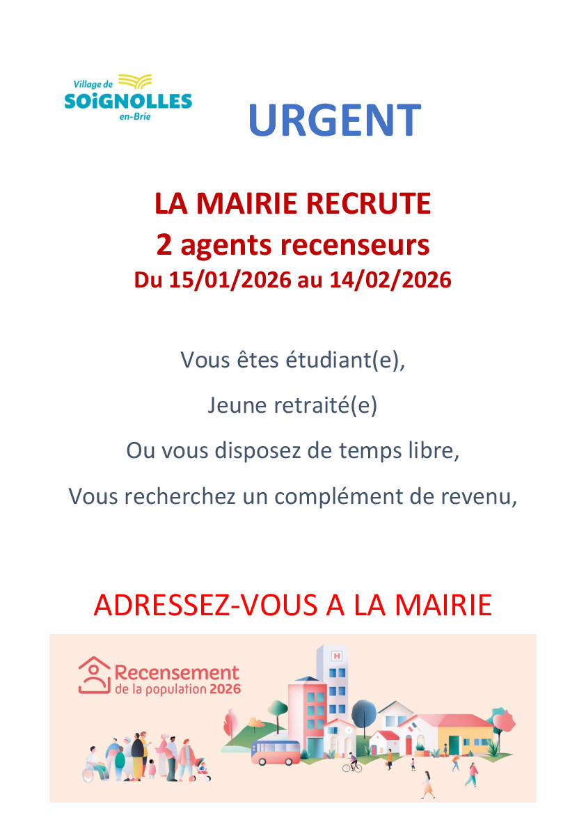 Cette année, La commune de Soignolles en Brie réalise le recensement de sa population pour mieux connaître son évolution, ses besoins et ainsi développer de petits et grands projets pour y répondre. L’ensemble des logements et des habitants seront recensés du jeudi 15 janvier au Samedi 16 février 2026.