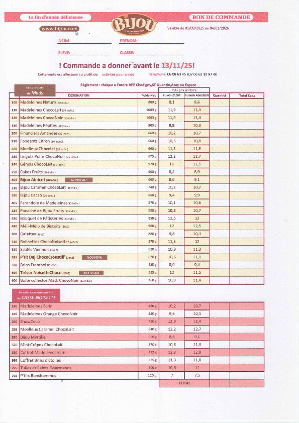Tout le monde peut commander : il suffit de remplir le bon de commande et d'adresser un chèque à l'ordre de l'APE d’Azay-sur-Indre, Chedigny et Saint Quentin sur Indrois.