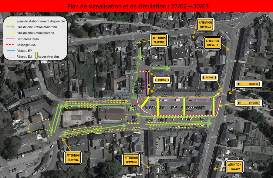 Le stationnement et la circulation sont réglementés sur la Place du 11 novembre afin de permettre la progression des travaux tout en maintenant un double flux de circulation le long du Cardinal