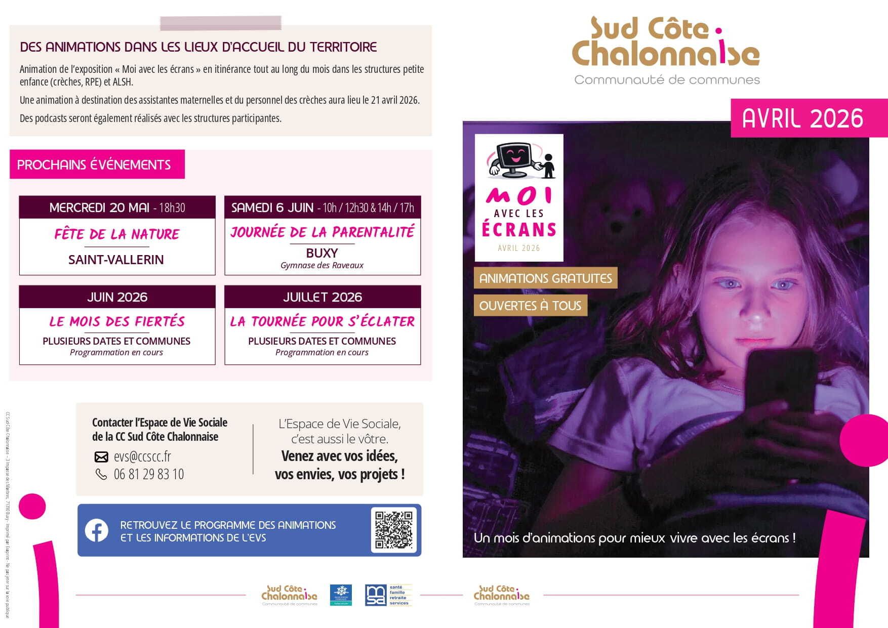 L'Espace de Vie Sociale de la CC Sud Côte Chalonnaise a été officiellement lancé le 3 mars 2026. C'est un service de proximité qui œuvre pour l'animation de la vie locale auprès de tous les publics. Il développe des actions visant à renforcer les liens sociaux et à favoriser le vivre ensemble.