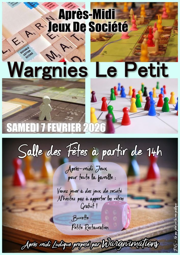 Rendez-vous samedi 7 février 2026 à la salle des fêtes pour une bonne session de jeux organisée par Wargni'mation .