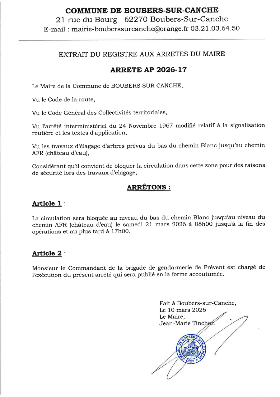 Travaux d'élagage dans le bas du chemin Blanc le samedi 21 mars 2026 de 08h00 à 17h00.
