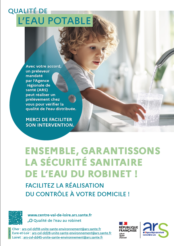 L'Agence régionale de santé (ARS) Centre-Val de Loire peut être amenée à réaliser des prélèvements d’eau au robinet chez des particuliers, dans le cadre du contrôle sanitaire de l’eau destinée à la consommation humaine afin de vérifier la qualité de l’eau distribuée.