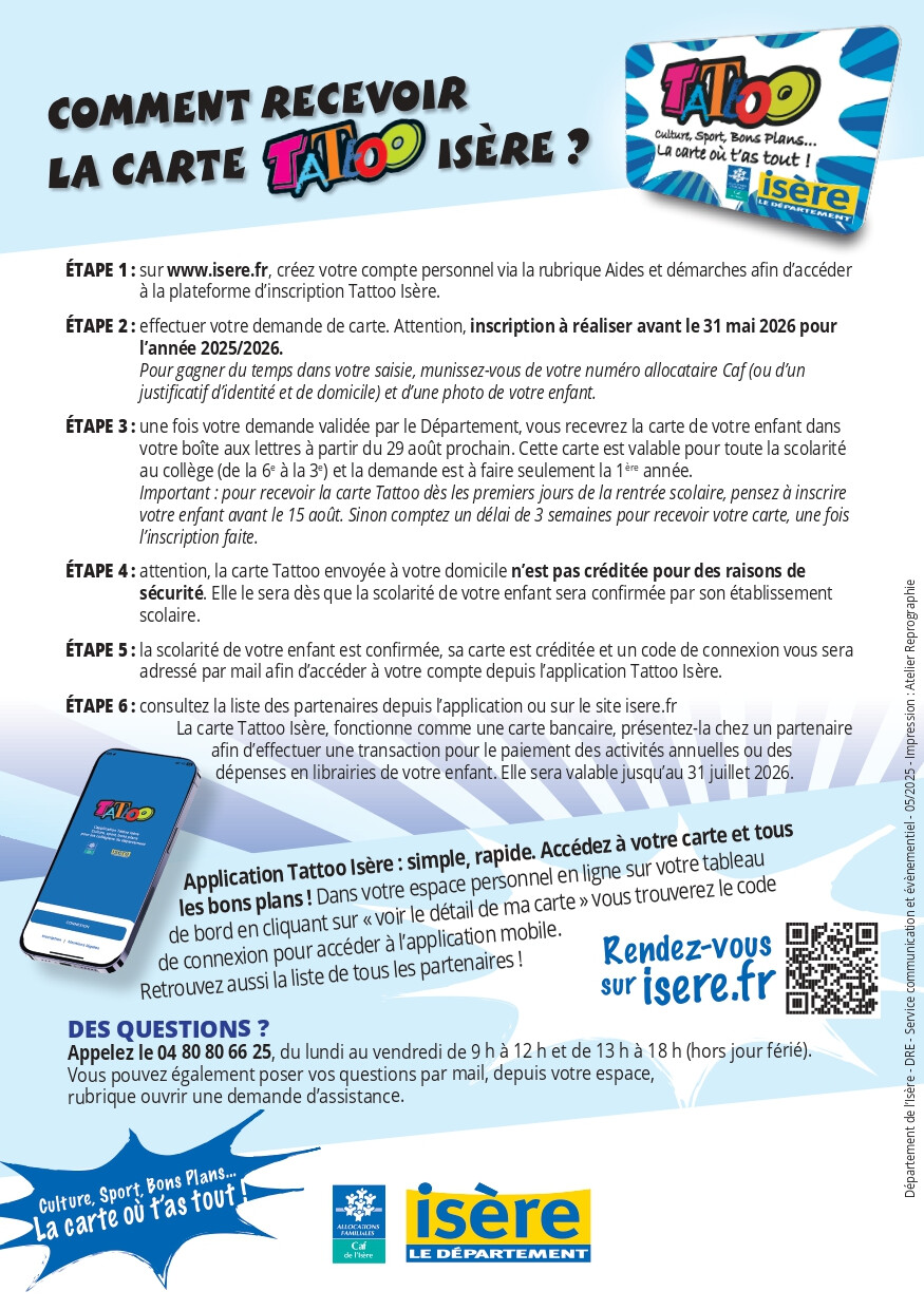 Le Département de l'Isère, en partenariat avec la Caf de l'Isère, propos à tous les collégiens la carte TATOO ISÈRE.
