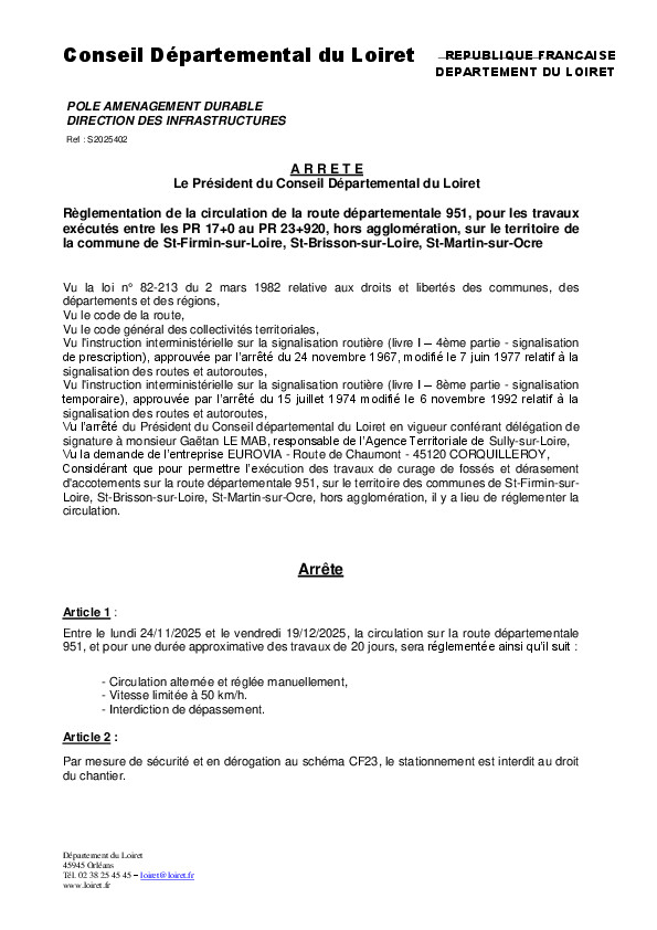 Entre le lundi 24/11/2025 et le vendredi 19/12/2025, la circulation sur la route départementale 951, et pour une durée approximative des travaux de 20 jours, sera réglementée ainsi qu’il suit :