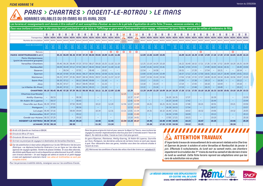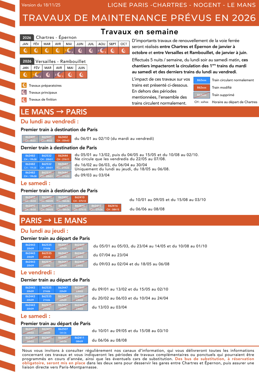 - Le dernier train au départ de Paris-Montparnasse circulera à 20h09 (soit 1 heure plus tôt que lors de la première phase de travaux, où le dernier départ était assuré à 21h06). Il desservira les gares suivantes : Versailles, Rambouillet, Gazeran, Épernon, Maintenon, Saint-Piat, Jouy, La Villette–Saint-Prest et Chartres (terminus).