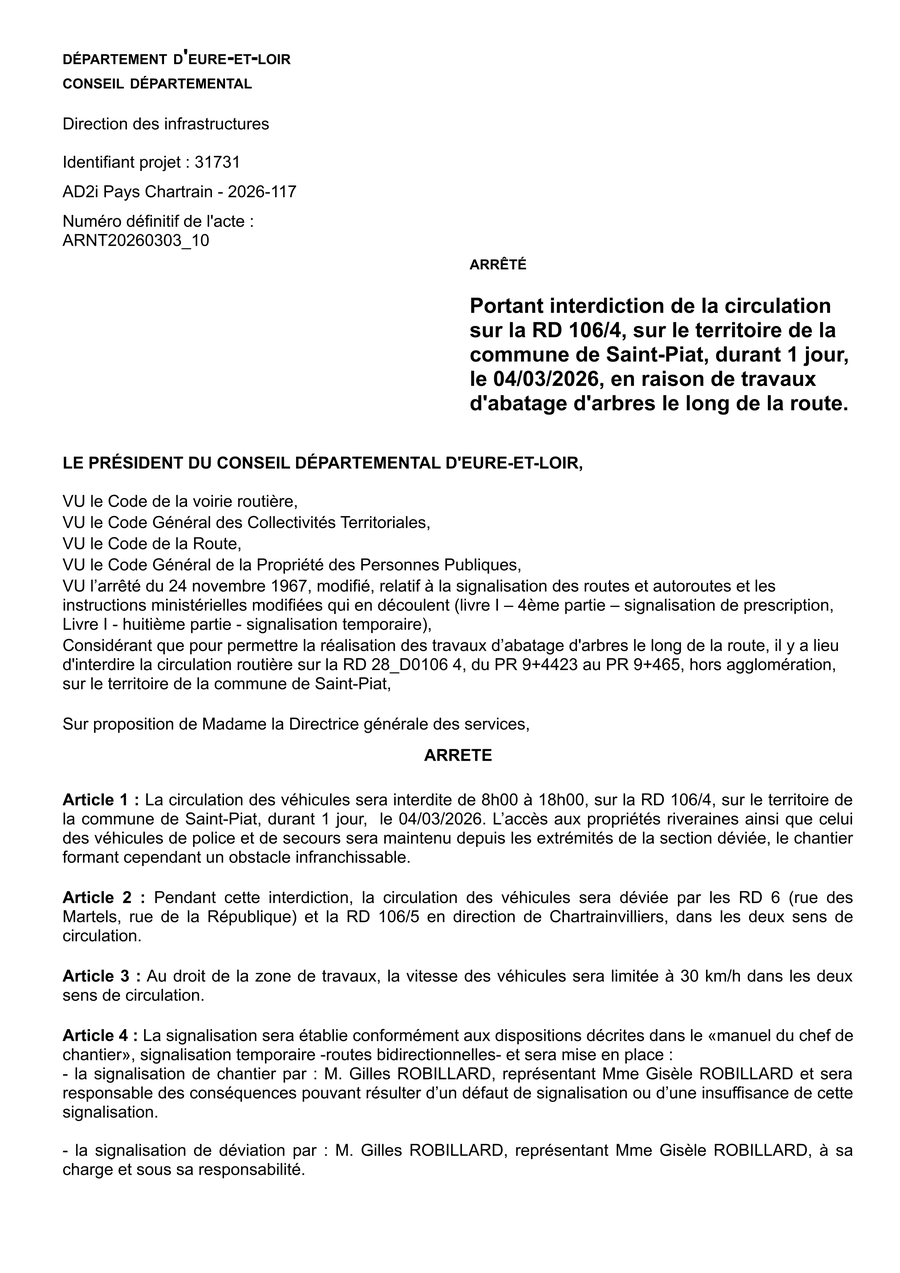 Des travaux de coupes d'arbre seront réalisés en sortie de Saint-Piat direction Chartainvilliers.