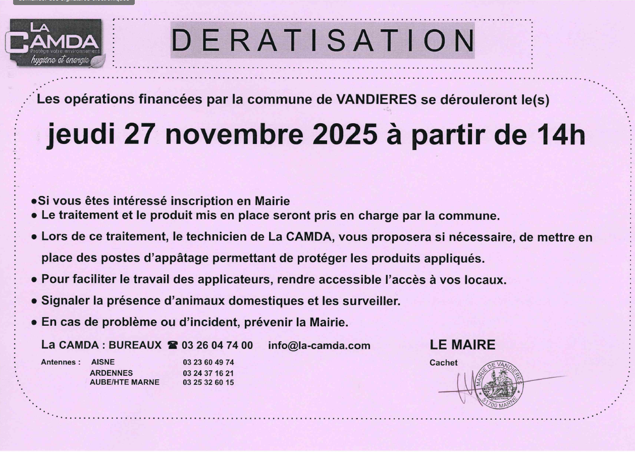 La prochaine campagne de dératisation sur notre commune aura lieu le jeudi 27 novembre 2025 à partir de 14h.