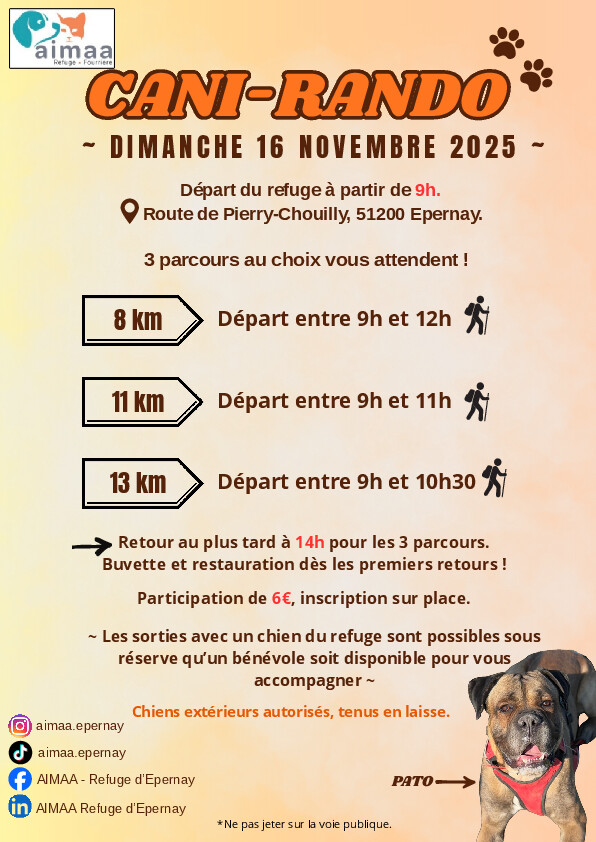 Le refuge A.I.M.A.A. d’Épernay organise une nouvelle édition de sa Cani-Rando le dimanche 16 novembre 2025, au départ du refuge (Route de Pierry-Chouilly, Épernay).