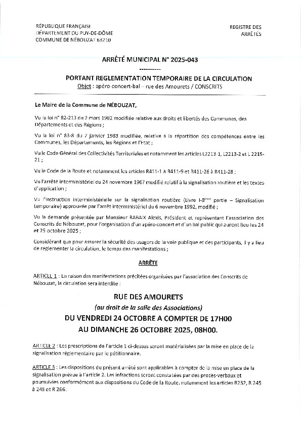 Joël MATHURIN, Préfet du Puy-de-Dôme de placer la Commune de Nébouzat en VIGILANCE pour l'usage de l'eau prélevée en eaux superficielles
