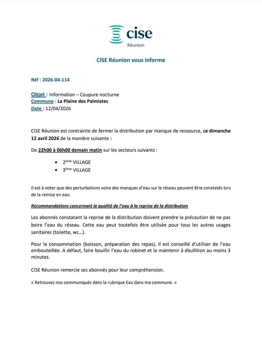 CISE Réunion va procéder aux travaux de lavage et de désinfection du réservoir Mimosas sur la commune de la Plaine des Palmistes.