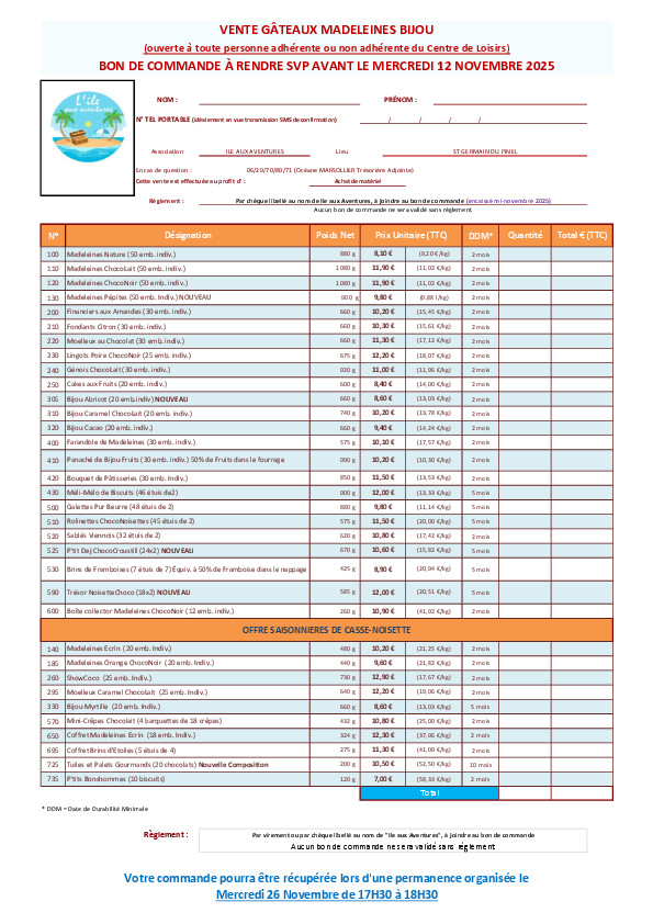 Vous pouvez passer commande en déposant le bon de commande à l'accueil de loisirs ;)