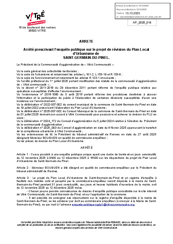 Par arrêté n°2025-014, du 15/10/2025, le Président Vitré Communauté a ordonné l’ouverture de l’enquête publique sur le PLU de Saint-Germain-du-Pinel en cours de révision.