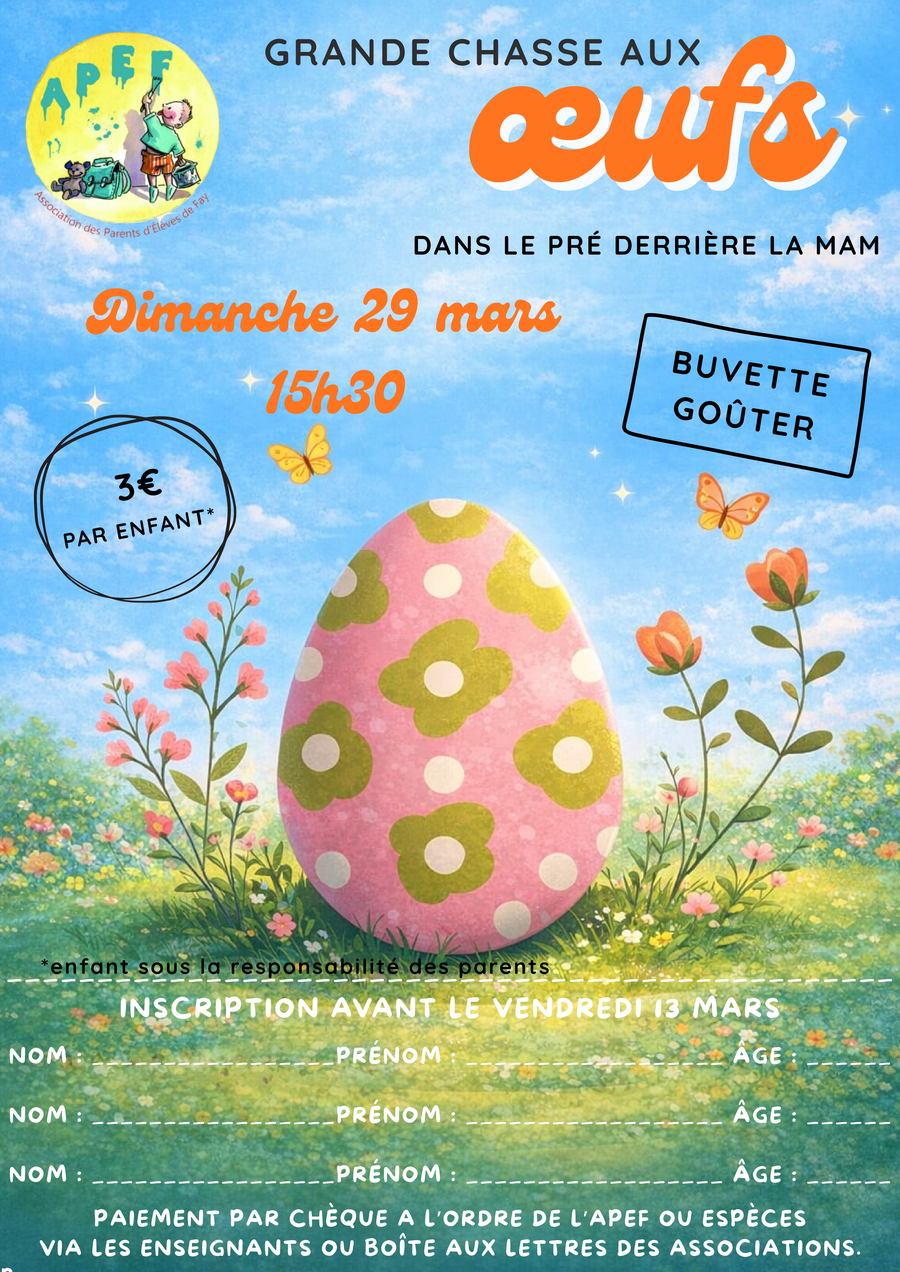 🐣 L’APEF invite les enfants et leurs familles à participer à une grande chasse aux œufs pleine de surprises et de gourmandises !