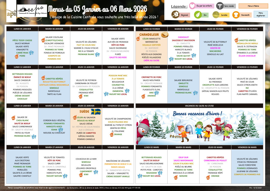 Concernant les commandes de repas de la cantine, notre prestataire (API Restauration) nous impose de passer les commandes le jour d'école précédent avant 10 heures (pour le repas du jeudi, la commande doit être passée le mardi, pour le repas du lundi, la commande doit être passée le vendredi)