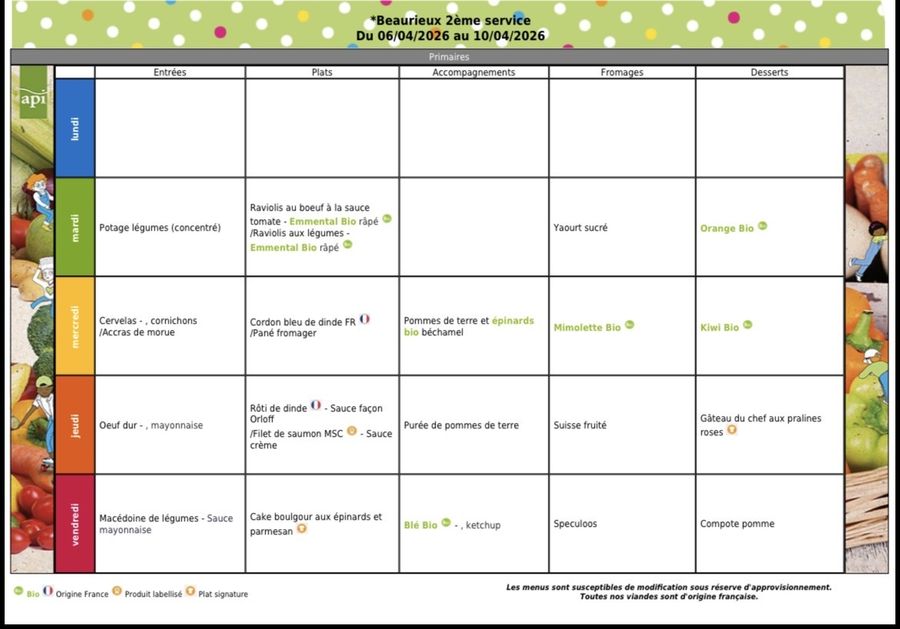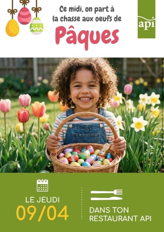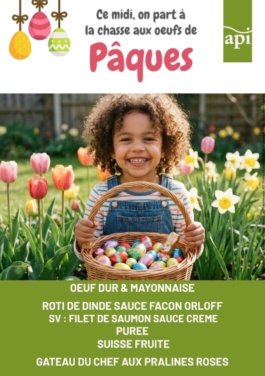 Cette semaine, nos chefs ont mis les petits plats dans les grands (ou les grands plats dans les assiettes des petits !) pour fêter Pâques avec un repas plein de couleurs et de saveurs : œufs durs mayonnaise, rôti de dinde sauce façon orloff accompagné d'une purée, un suisse fruité et pour finir un gâteau du chef aux pralines roses.