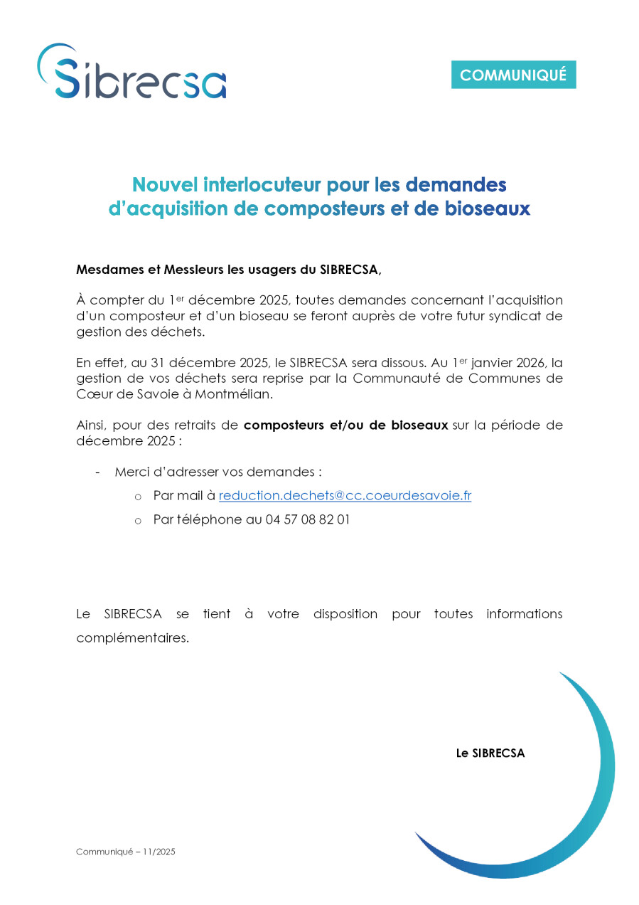 Si vous souhaitez acheter un composteur ou un bioseau, le SIBRECSA en arrête la vente le 28 novembre.