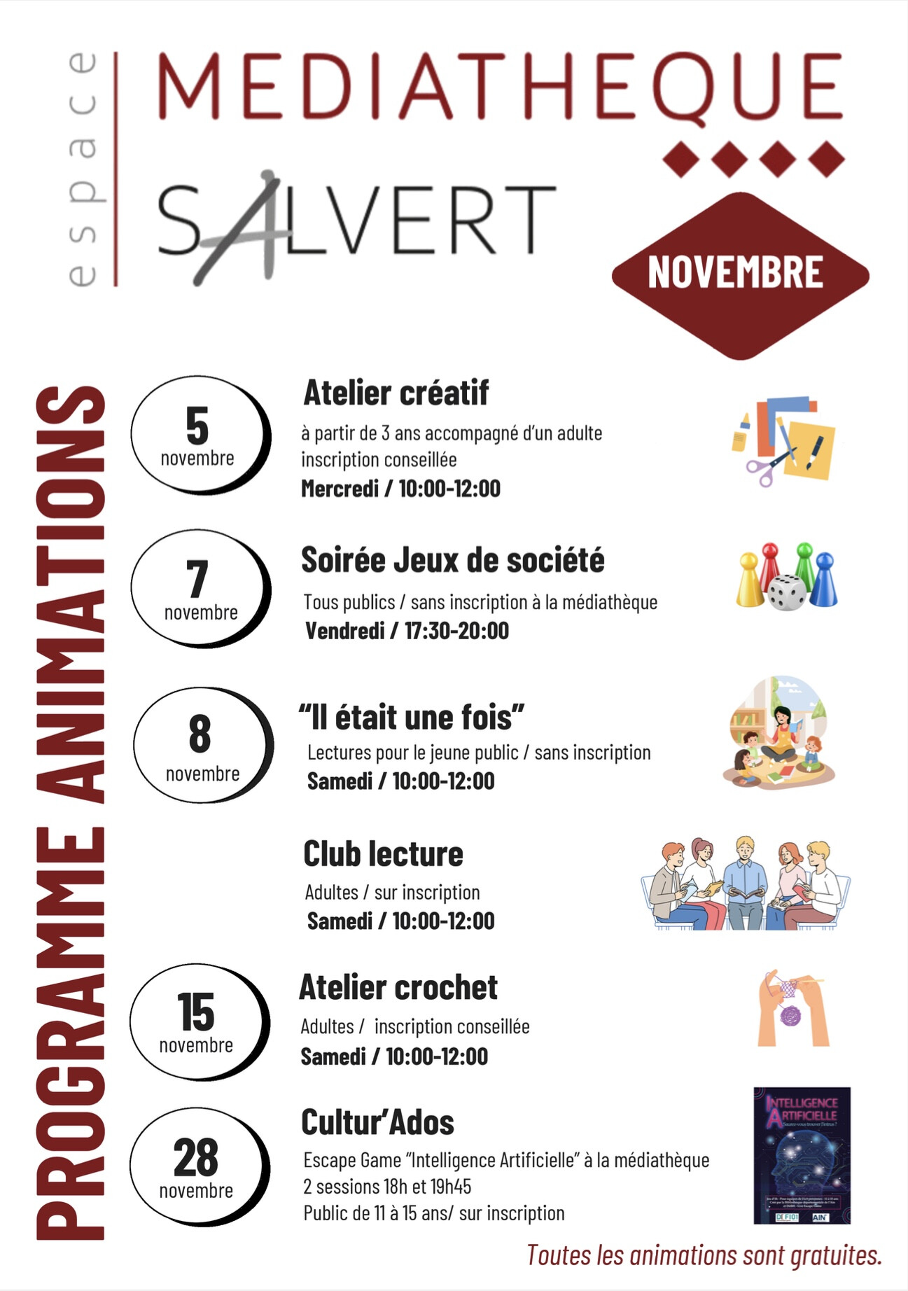 Programme des animations de la Médiathèque Salvert d’Attignat pour le mois de novembre.