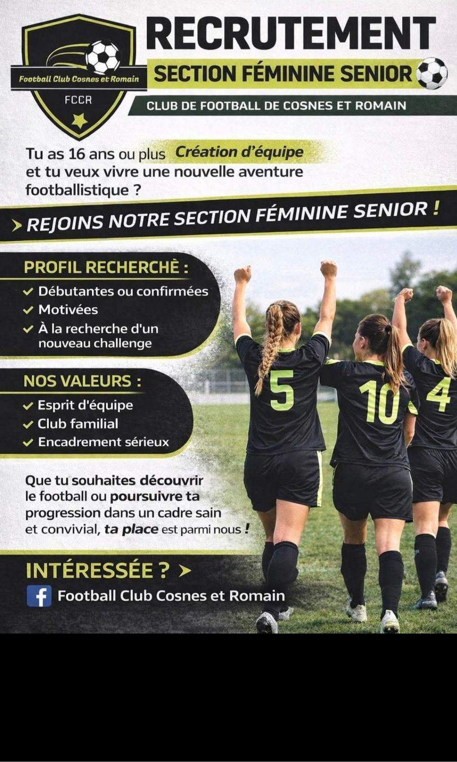 Dans le cadre du développement de notre club et de nos nouveaux projets, le Football Club Cosnes et Romain souhaite créer une équipe féminine senior