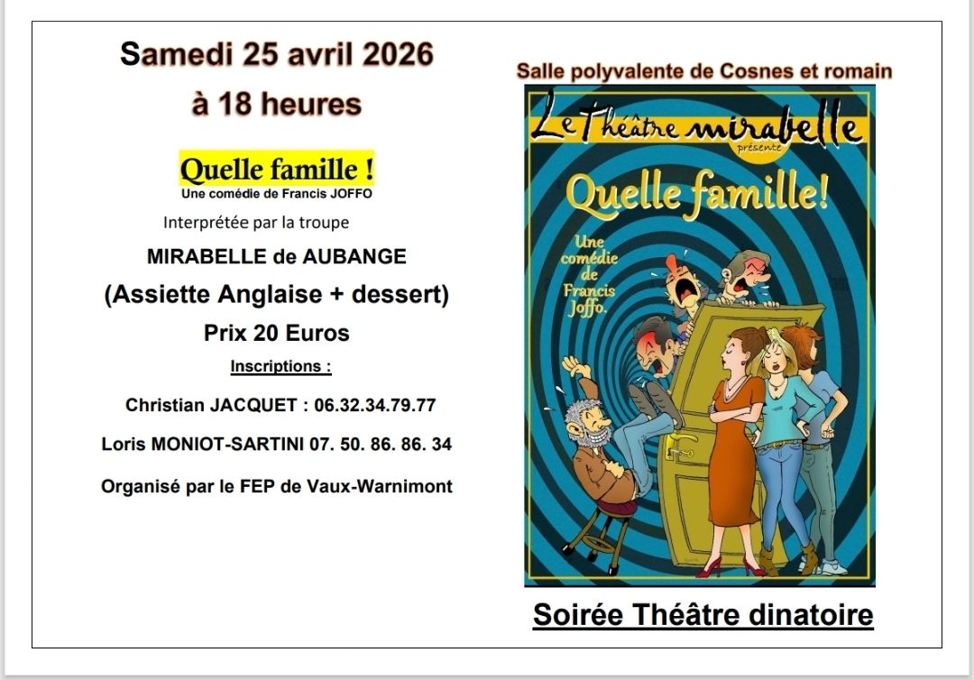 La pièce, qui sera interprétée par la troupe MIRABELLE de AUBANGE, s'intitule “QUELLE FAMILLE !”