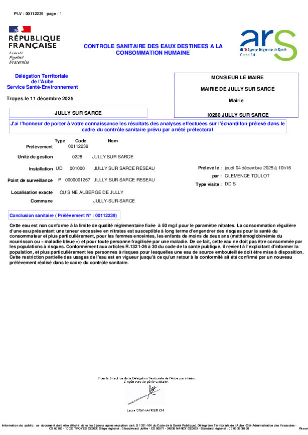 POUR INFORMATION LE TAUX DE NITRATE A ETE RELEVE A 55MG/L ALORS QUE LA NORME SE SITUE A 50MG/L.