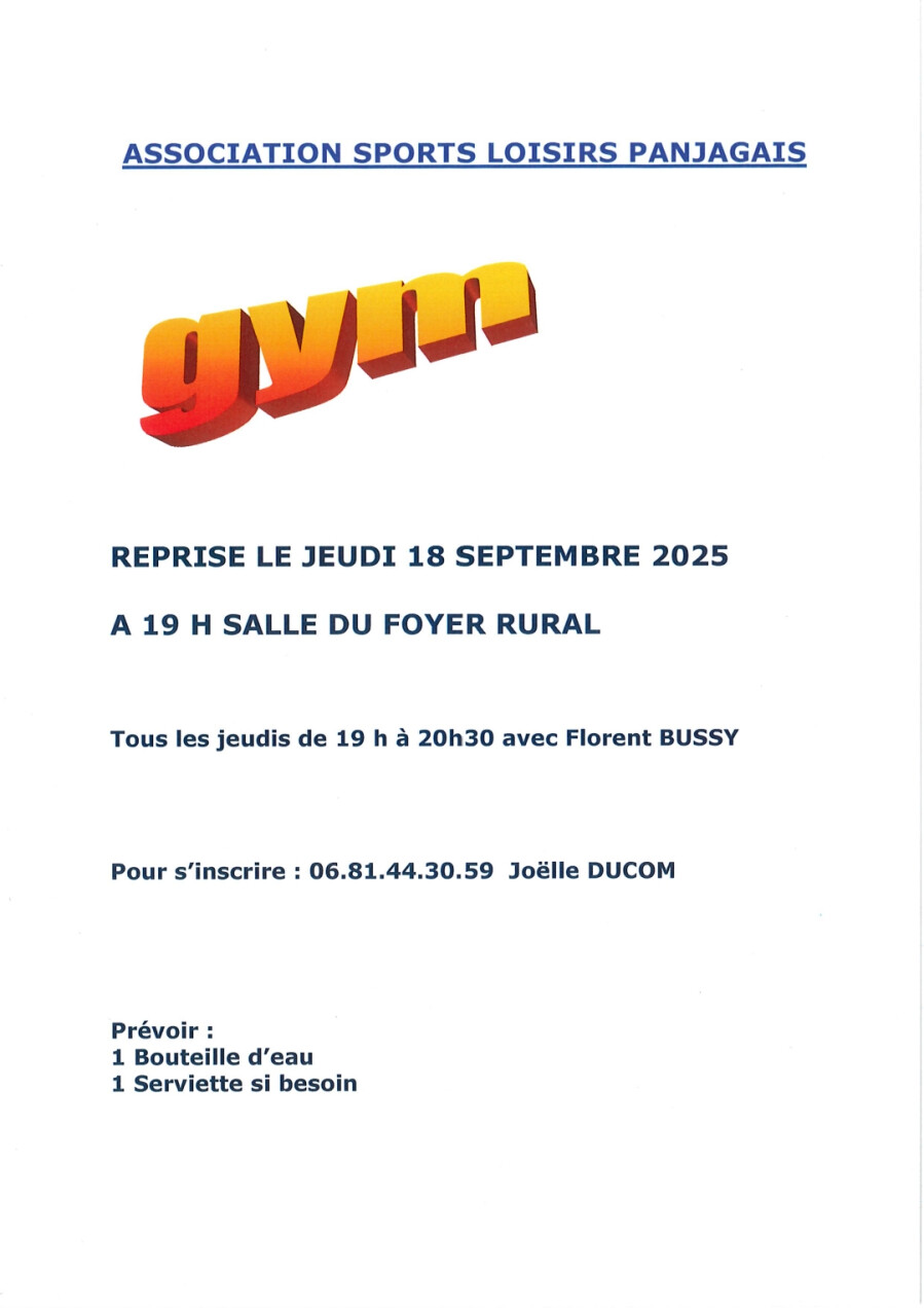 - GYM : Reprise le jeudi 18 septembre à 19h