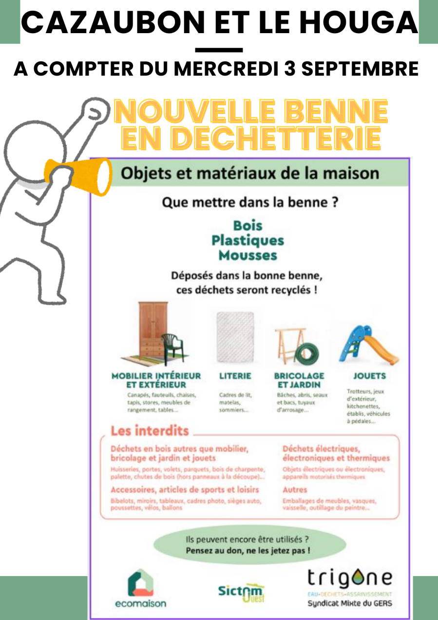 ✨ A partir du 3 septembre, une nouveauté pour mieux valoriser vos déchets : deux bennes Éco-Maison seront installées à la déchetterie de Le Houga et de Cazaubon.