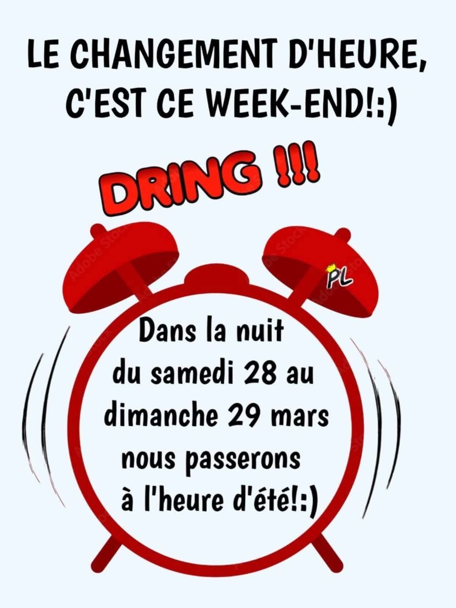 "N'oubliez pas ! On passe à l'heure d'été cette nuit. 🕒➡️☀️ On avance nos montres d'une heure. Une heure de dodo en moins, mais tellement de soleil en plus !"