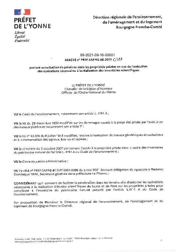 M. le Préfet de l’Yonne a signé un arrêté préfectoral en date 16 août 2021 donnant autorisation aux personnels de la DREAL, ainsi qu’aux personnes des structures auxquelles elle délègue ses droits de pénétrer dans les propriétés privées pour mener à bien les études de connaissances naturalistes.