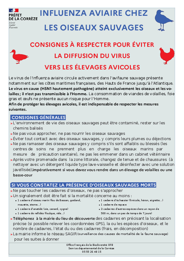 Une communication grand public va être effectuée par la préfecture de la Corrèze, indiquant aux particuliers constatant des oiseaux de la faune sauvage de les signaler à la mairie du lieu de découverte, à l'Office français de la biodiversité (OFB) ou la Fédération départementale des chasseurs.