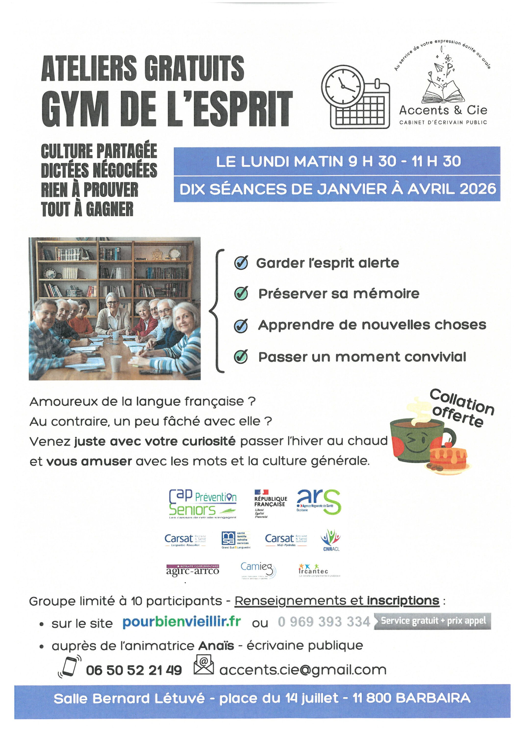 Des ateliers gratuits de gym de l'esprit auront lieu à Barbaira entre janvier et avril 2026.