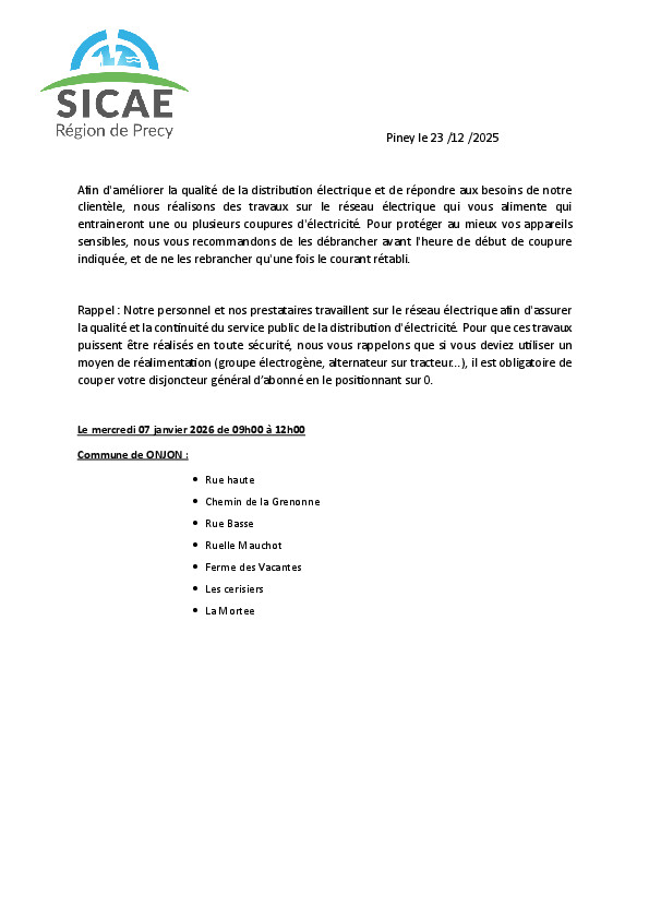 La SICAE informe ses abonnés, qu'en raison de travaux sur le réseau, le courant sera coupé :