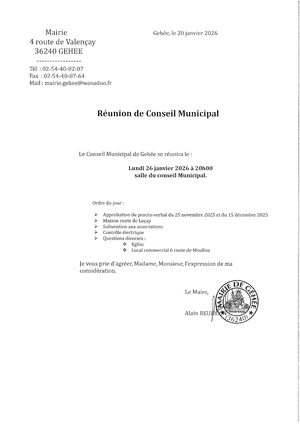 Réunion de coseil municipal le Lundi 26 janvier 2026 à 20h00