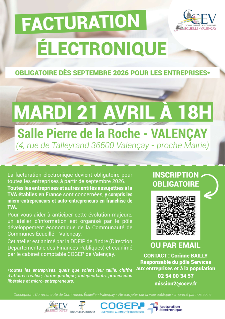 Cette réunion d'informations sera animée par la Direction Départementale des Finances Publiques de l'Indre et coanimée par le cabinet comptable COGEP de Valençay, le Mardi 21 avril à 18h, Salle Pierre de la Roche, 4 rue de Talleyrand, 36600 Valençay (proche Mairie)