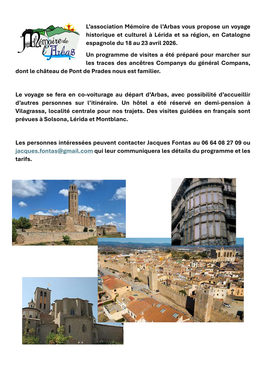 L’association Mémoire de l’Arbas vous propose un voyage historique et culturel à Lérida et sa région, en Catalogne espagnole