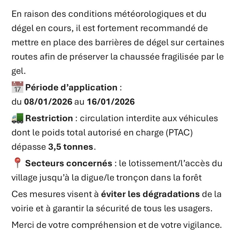 La société SCRE nous informe de bien vouloir respecter une barrière de dégel sur les voiries remises en état en fin d’année 2025 avec une limite de tonnage .