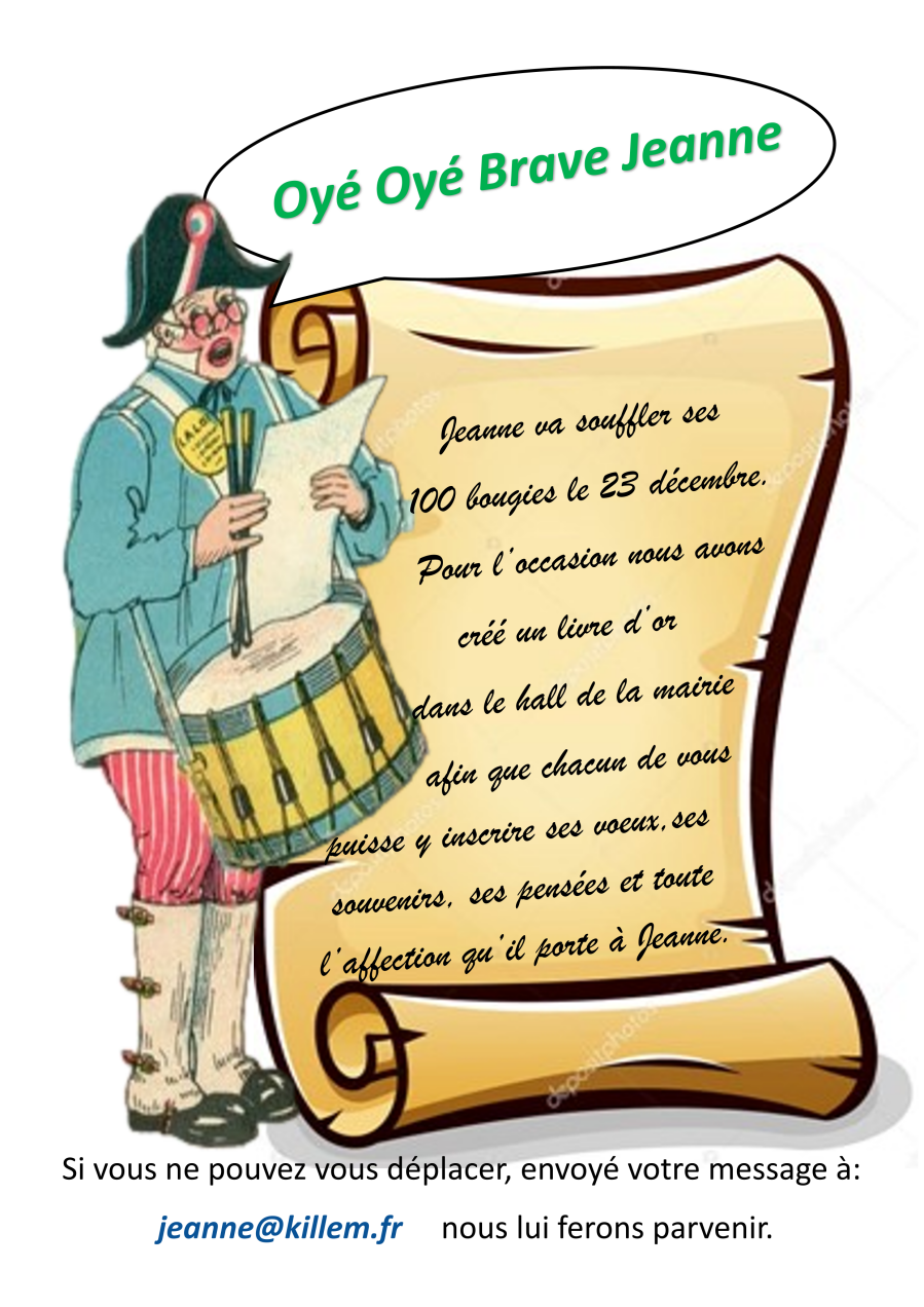 Oyé Oyé Brave Jeanne ! 🎉 Notre doyenne Jeanne Malbrancke va fêter ses 100 ans le 23 décembre ! Pour marquer cet événement exceptionnel, un livre d'or est à votre disposition à la mairie. Venez y inscrire vos vœux, souvenirs, pensées et témoignages d'affection pour Jeanne, afin de lui offrir un cadeau collectif inoubliable. Si vous ne pouvez pas vous déplacer, envoyez votre message à jeanne@killem.fr, nous nous chargerons de lui transmettre. Ensemble, célébrons ce siècle de vie et de souvenirs partagés ! 🎂💐
