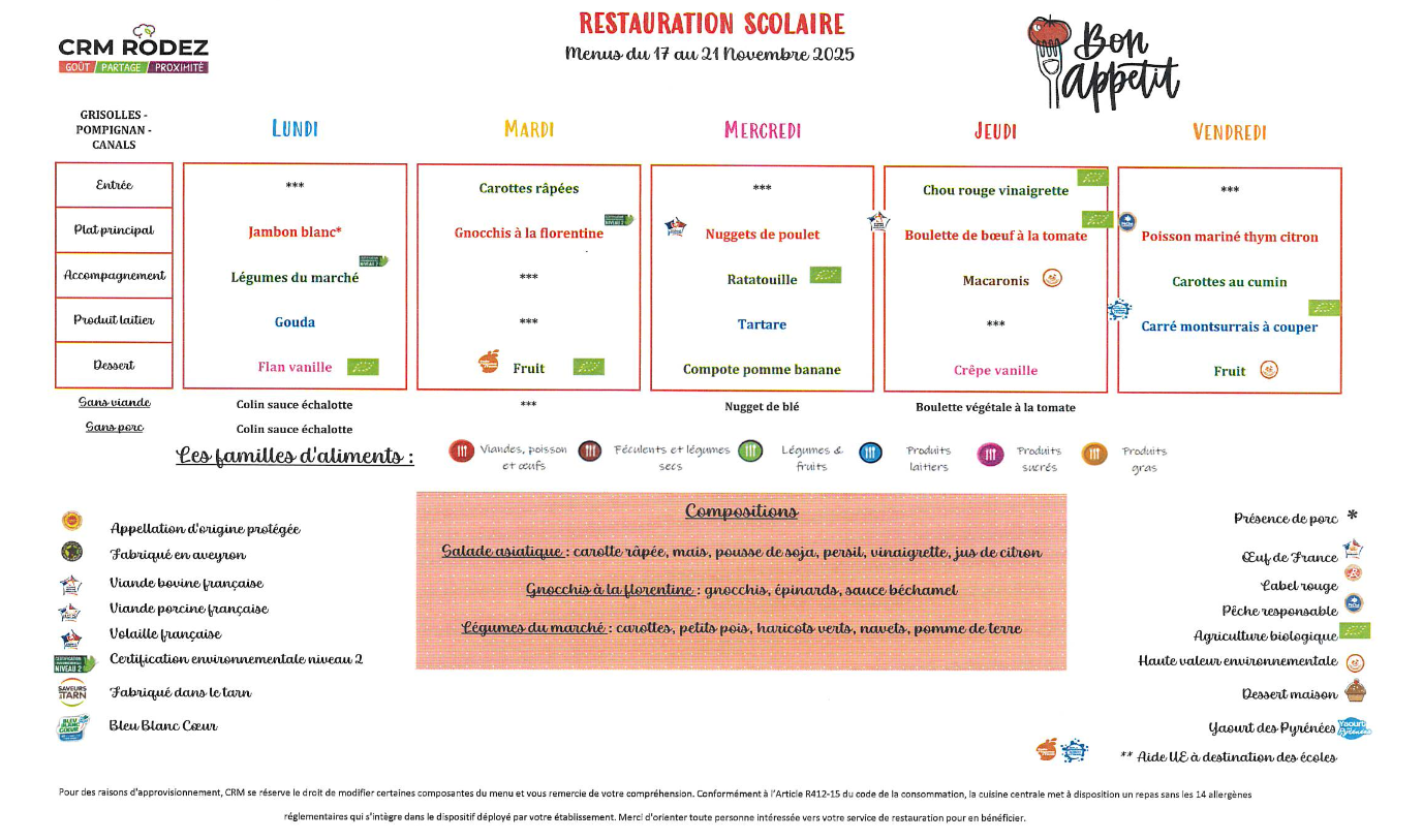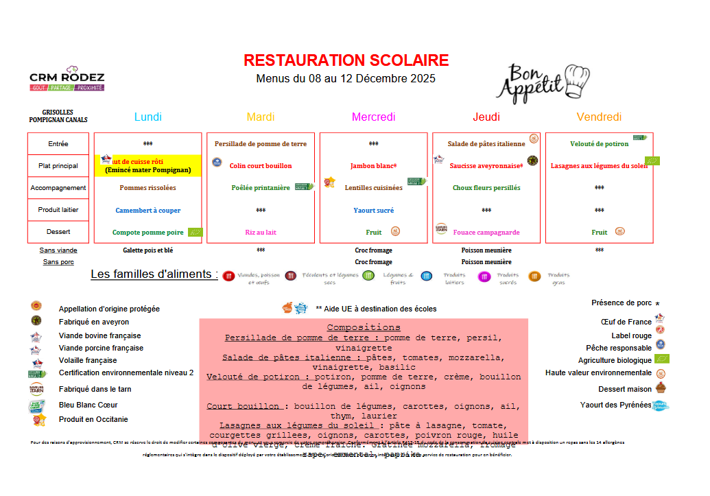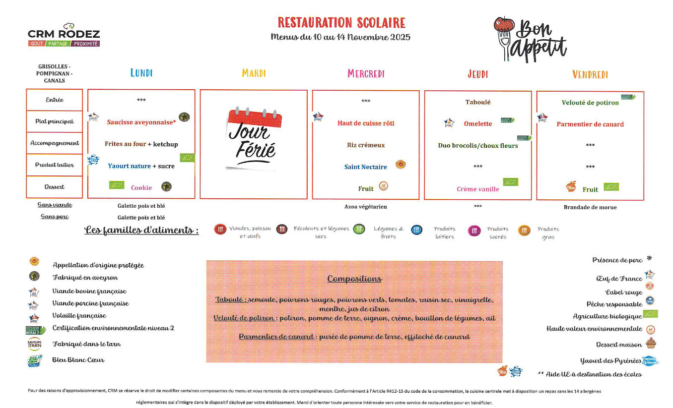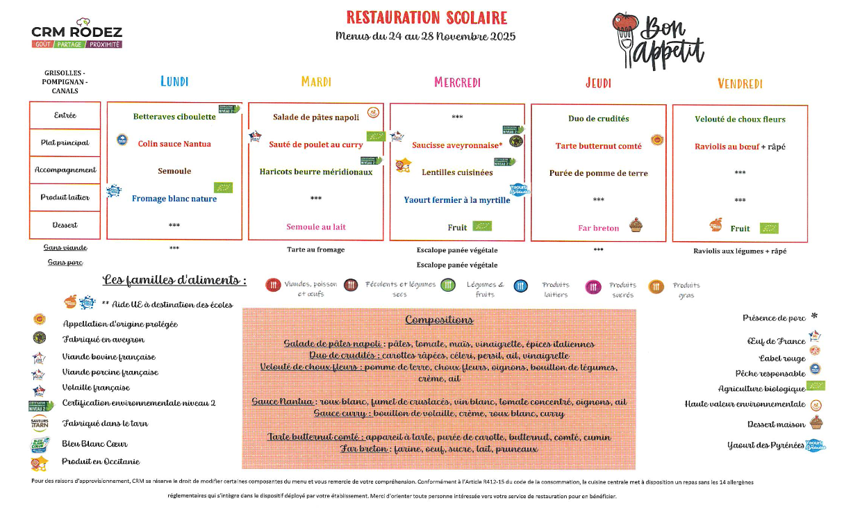 Le menu de la cantine pour la semaine à venir. Bon appétit bien-sûr !