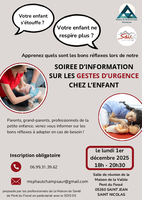 Les médecins et professionnels de santé de la Maison de Santé de Pont du Fossé vous proposent en partenariat avec le SDIS 05 une soirée d'information sur les Gestes de Secours chez l'Enfant.