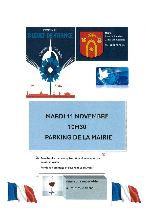Le départ pour la cérémonie du 11 Novembre sera à 10h30 sur le parking de la mairie.