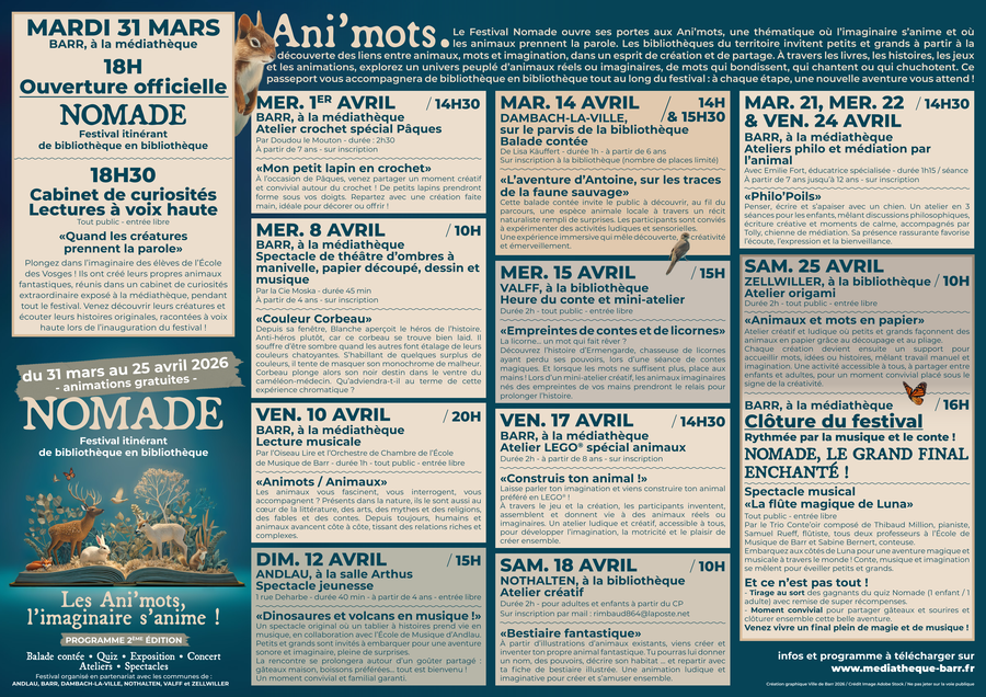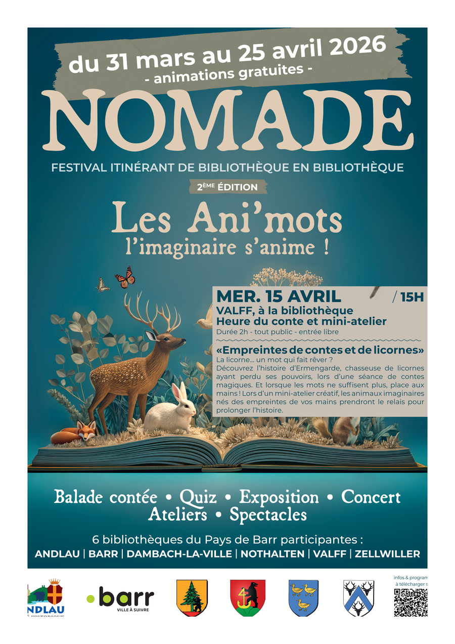 L'édition 2026 du festival Nomade a lieu du 31 mars au 25 avril dans 6 bibliothèques de la Com'com.