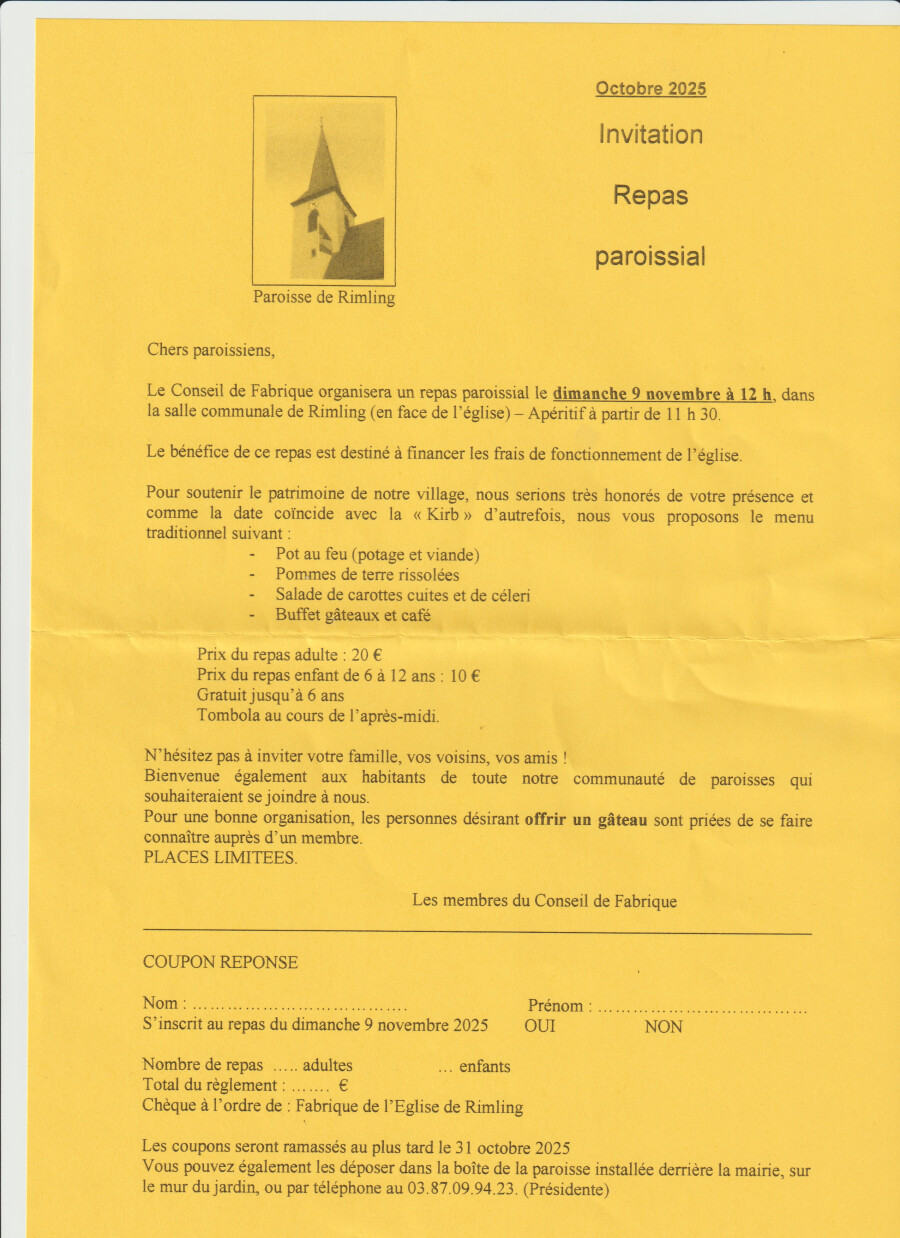 Le repas traditionnel de la KIRB organisé par le Conseil de Fabrique et de nombreux bénévoles aura lieu le dimanche 9 novembre à la salle communale de Rimling.