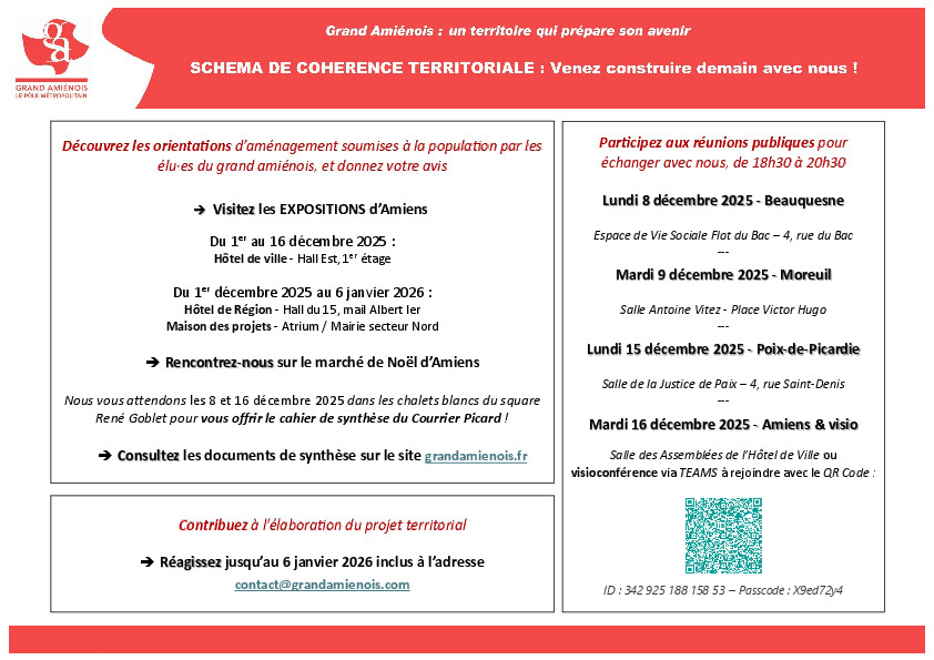 Le Pôle Métropolitain du Grand Amiénois lance une consultation citoyenne dans le cadre de la révision de son Schéma de Cohérence Territoriale (SCoT). Celui-ci formalise les orientations d'aménagement pour les 20 prochaines années en matière, par exemple, d'économie, de commerce, de biodiversité, de transport ou encore de logement.